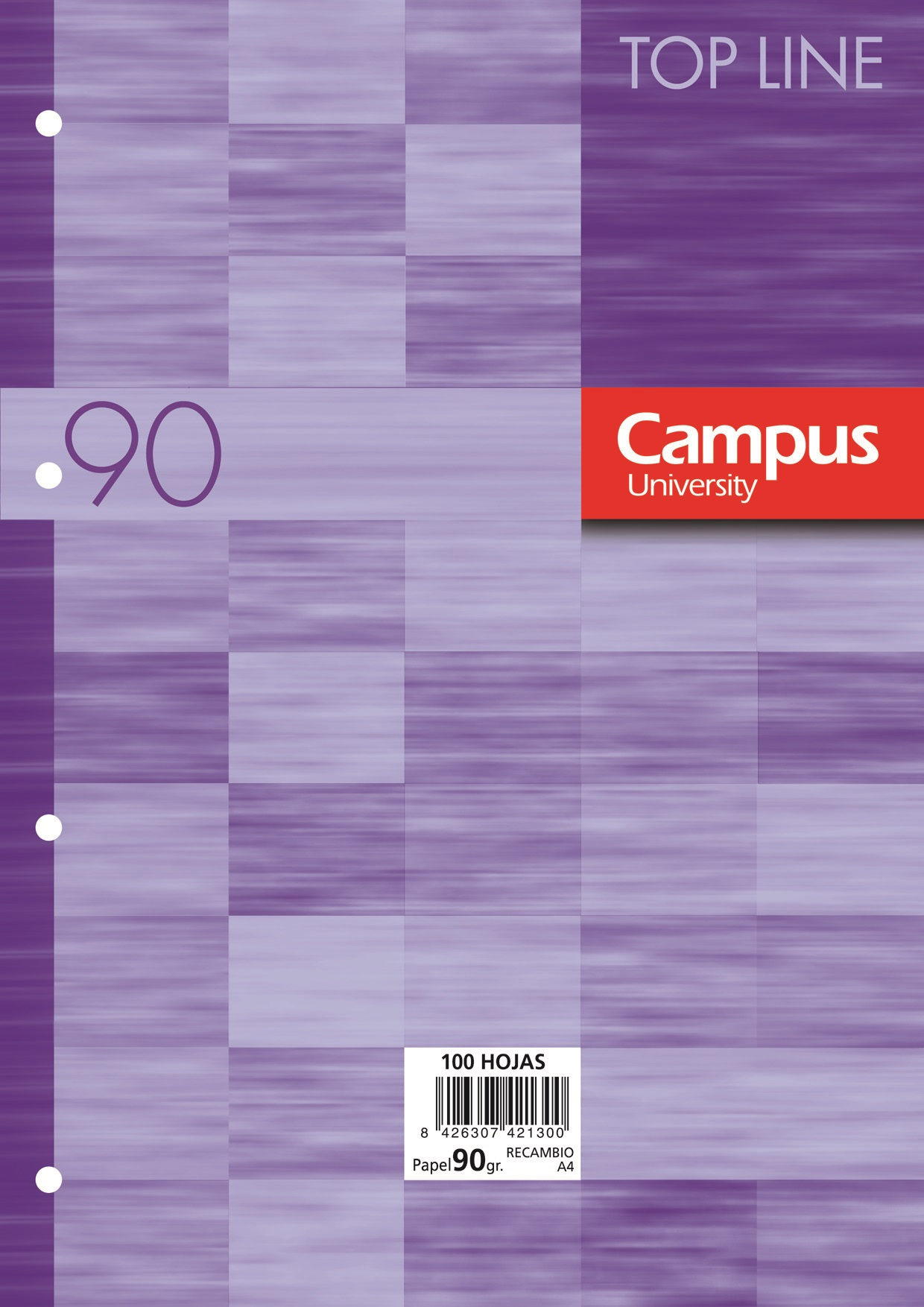 Recambio de papel DIN A4 de 90 gramos. De 4 anillas. 100 hojas. Rayado Cuadro 5x5. Ribete Morado. Campus.