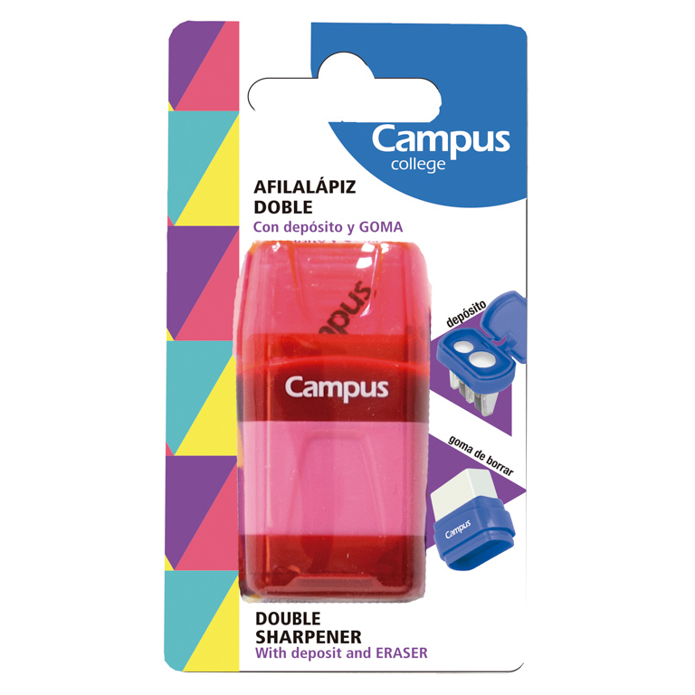 Blíster de Sacapuntas Afilalápiz Doble Con Depósito y Goma. Colores Surtidos. Campus.