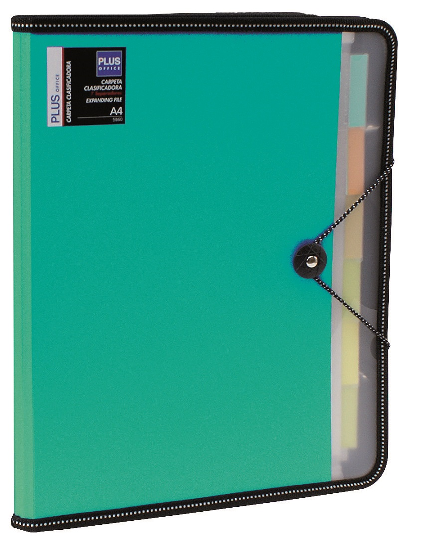 Clasificador de fuelle en polipropileno con 7 compartimentos y bloc, Formato Din A4, cierre con gomas.