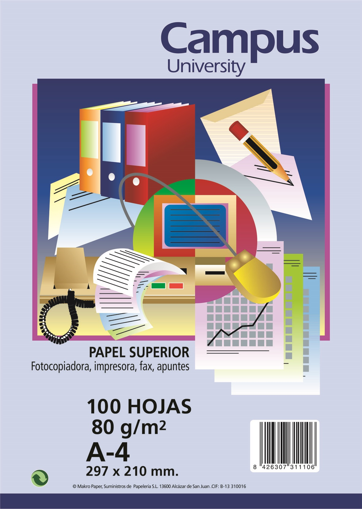 Papel en formato Din A4 de 80 gramos. Paquete de 100 unidades en color Blanco.
