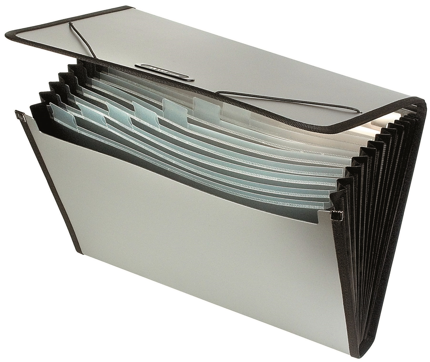 Clasificador de fuelle en polipropileno con 12 compartimentos, Formato Din A4, cierre con gomas. Colores metalizados