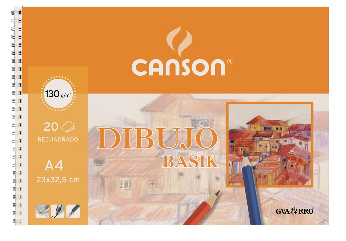 Cuaderno, Bloc de Dibujo Basic, Formato Din A4 con Espiral, Hoja Lisa con recuadro. Canson (600064)
